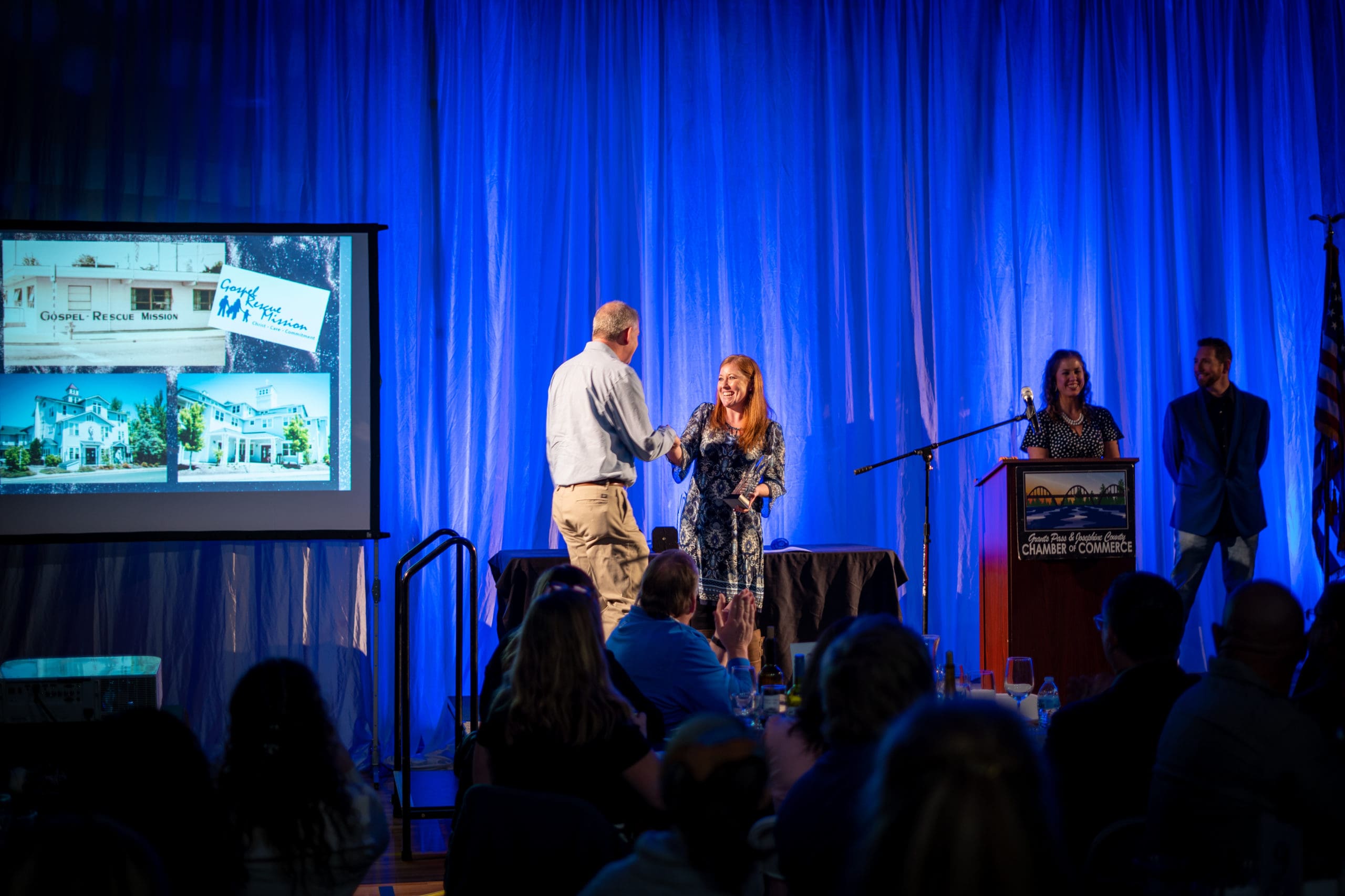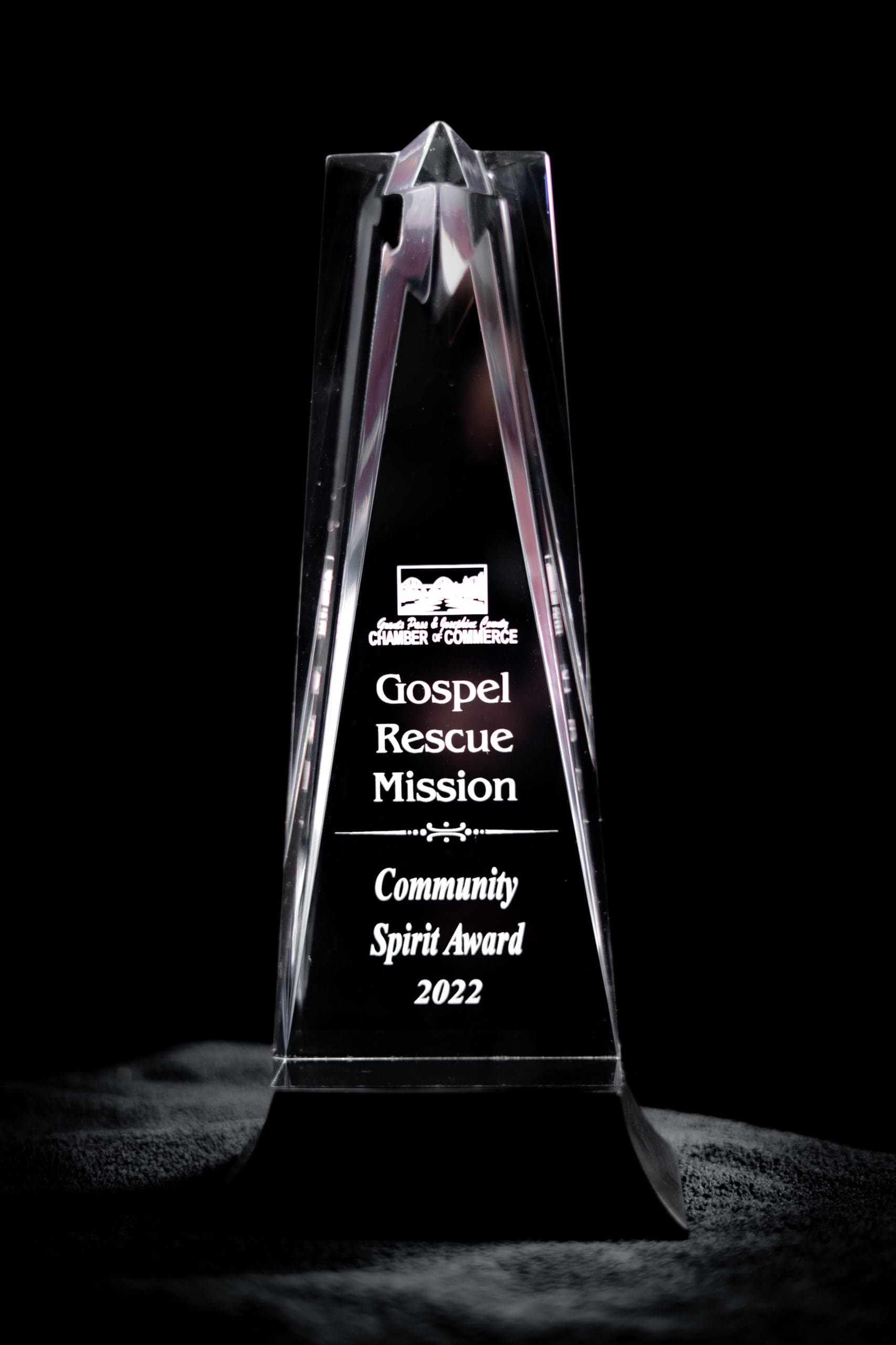 The Grants Pass Gospel Rescue Mission was honored to receive the “Community Spirit Award” at the Grants Pass & Josephine County Chamber of Commerce 98th Annual Awards Banquet. The Community Spirit Award is awarded to an organization or a citizen of Grants Pass and Josephine County who has made significant contributions to the level of supporting the spirit of the Grants Pass & Josephine County community.