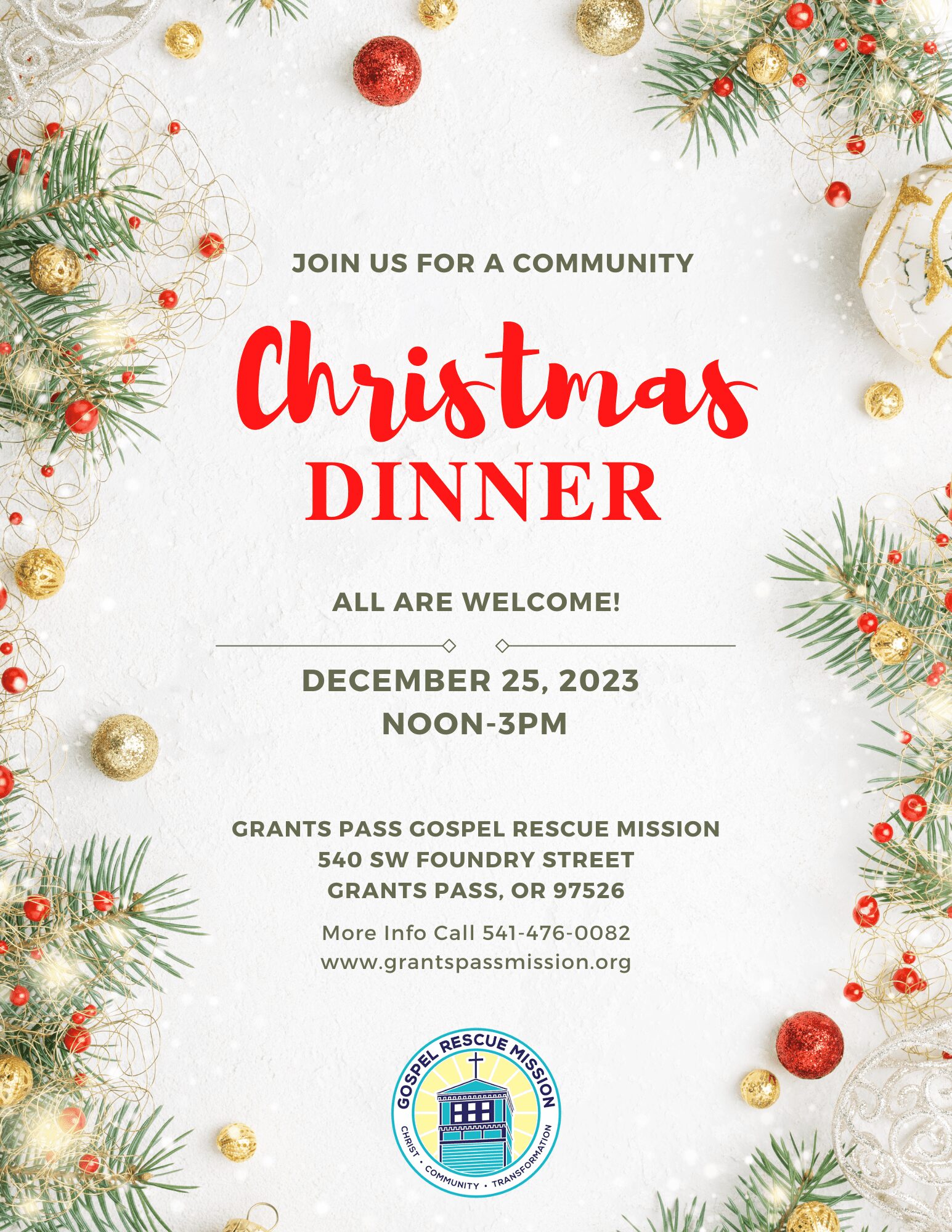 As the Grants Pass Gospel Rescue Mission prepares to host it’s yearly Community Christmas Dinner, we wanted to let you know that you’re invited! Join us for a time of food and fellowship as we celebrate our Savior’s birth.